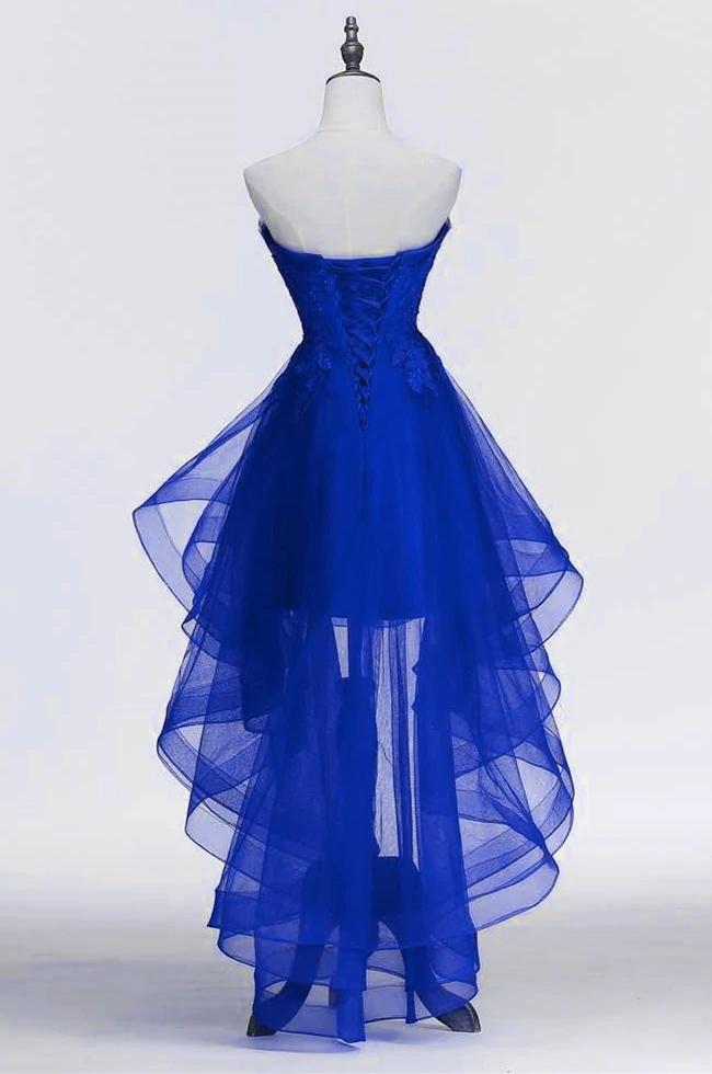 Royal Blue Tulle with Lace Applique High Low Party Dress, Blue Homecoming Dress