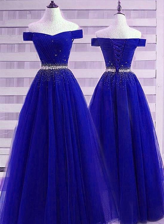 Sparkle Royal Blue Beaded Tulle A-line Long Evening Dress, Junior Prom Dress