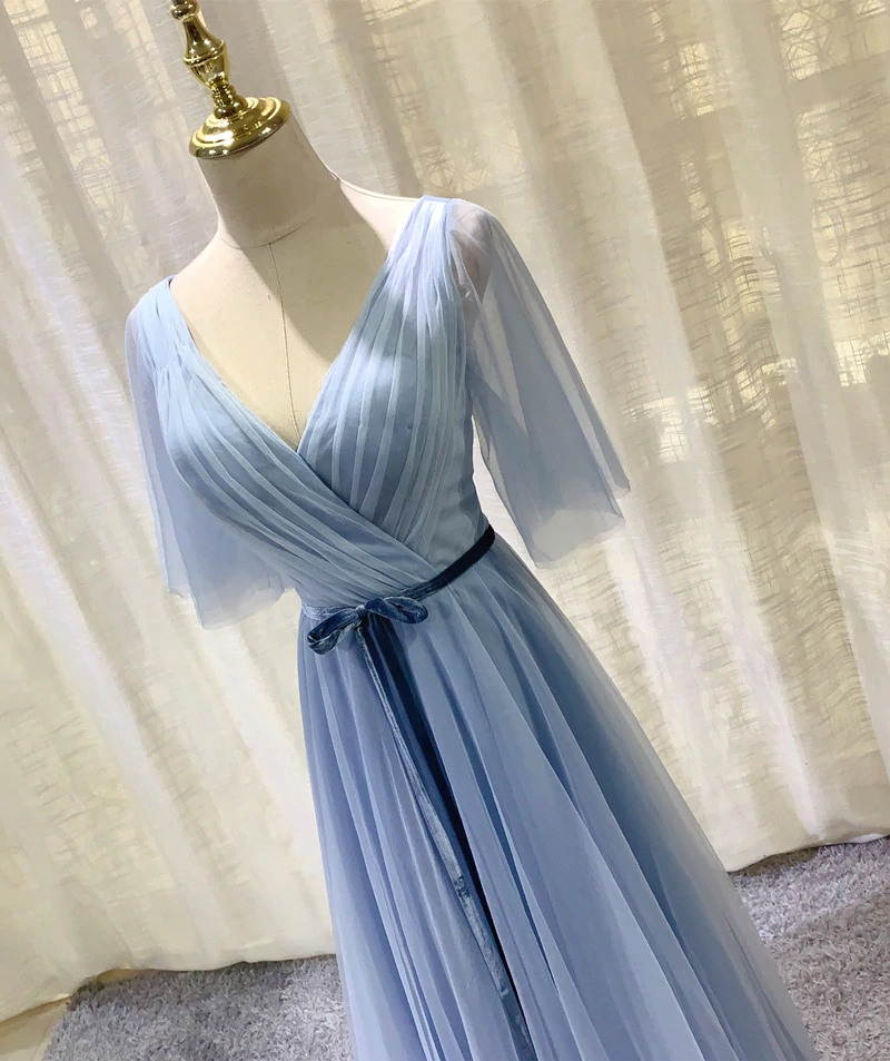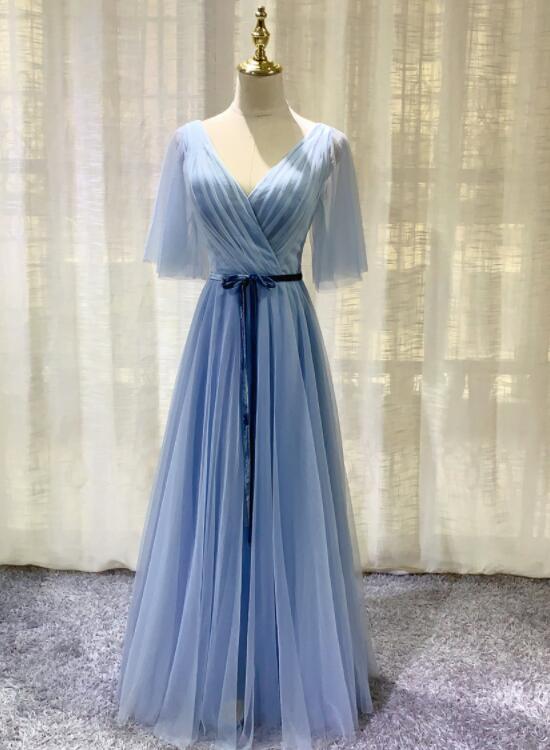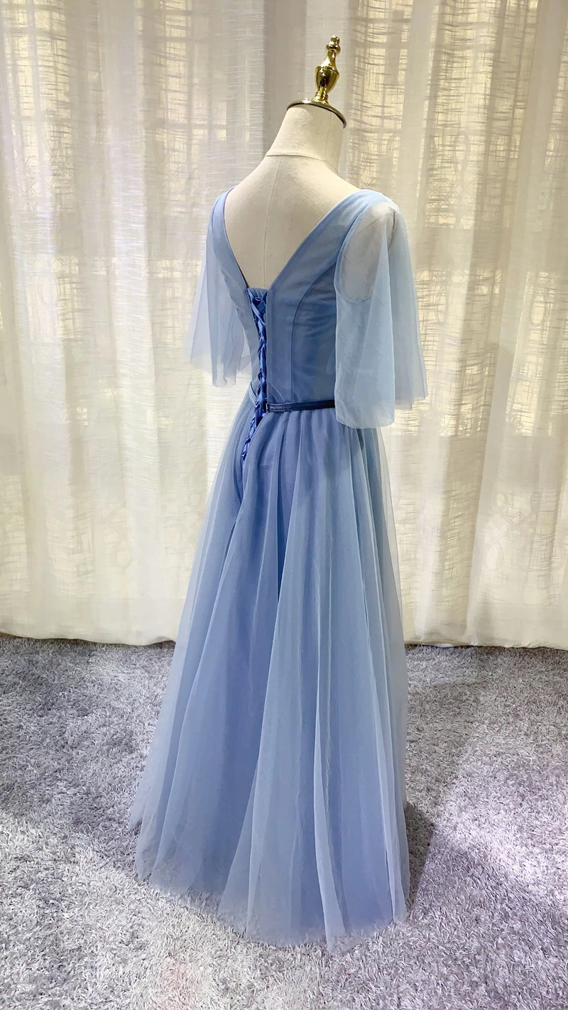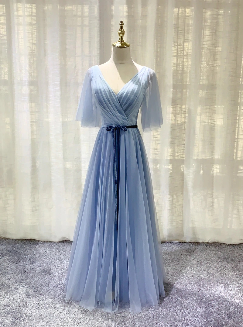 Elegant Light Blue V-Neckline Long Party Dress, A-line Prom Dresses