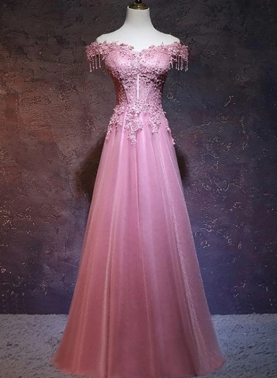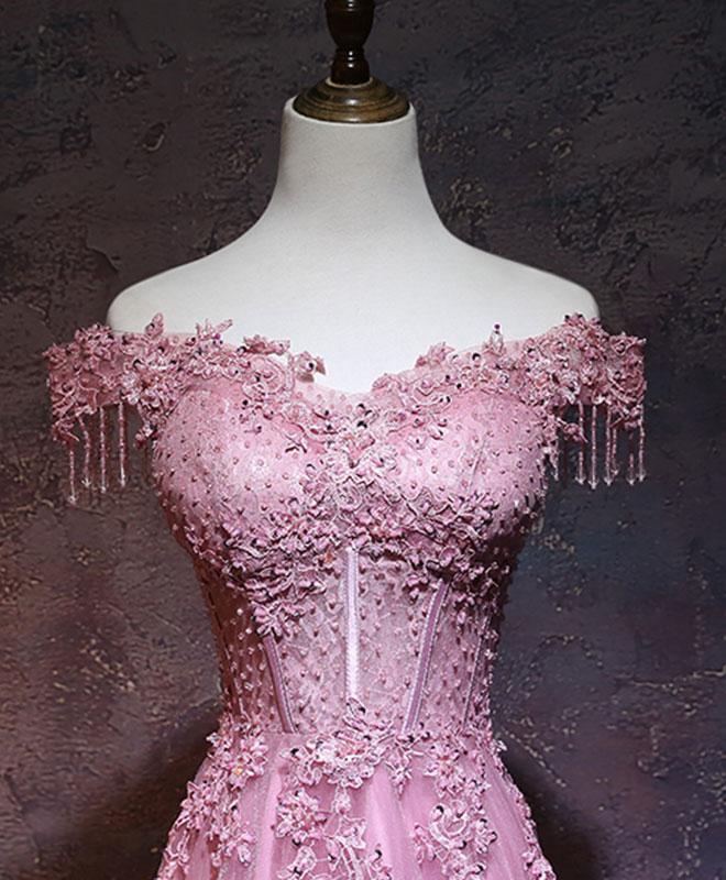 Pink Sweetheart Off Shoulder Lace Applique Long Prom Dress, Pink Bridesmaid Dress