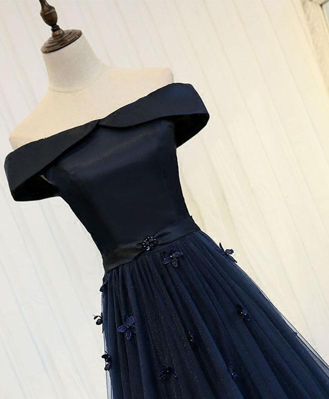 Navy Blue Off Shoulder Tulle Long Party Dress, A-line Floor Length Prom Dress