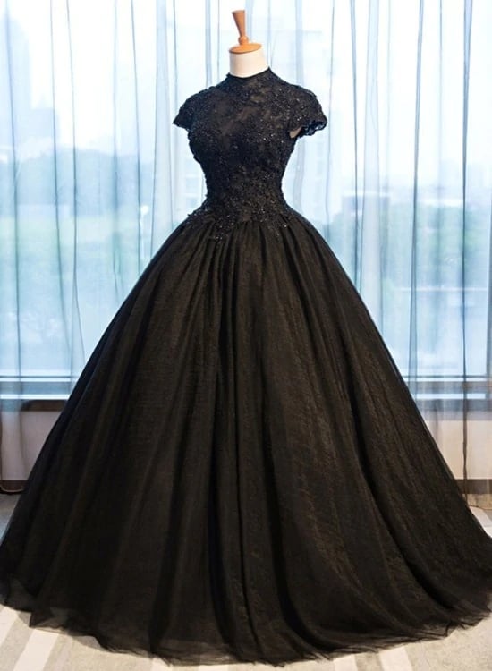 Black Cap Sleeves Long Tulle Party Dress, Black Prom Dress