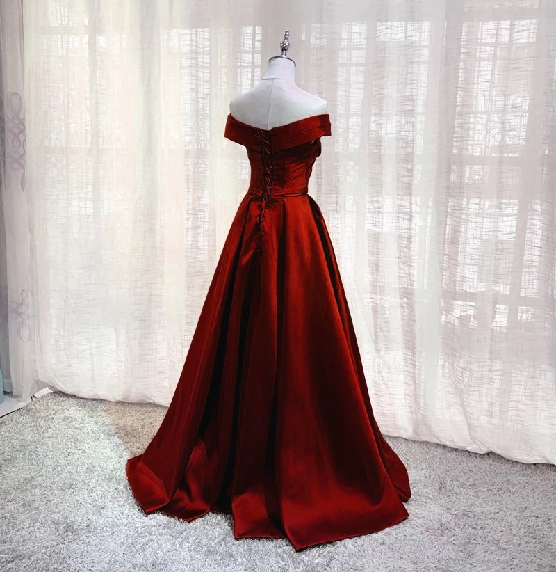 Wine Red Floor Length Off Shoulder Wedding Party Dress, Dark Red Prom Dress N053