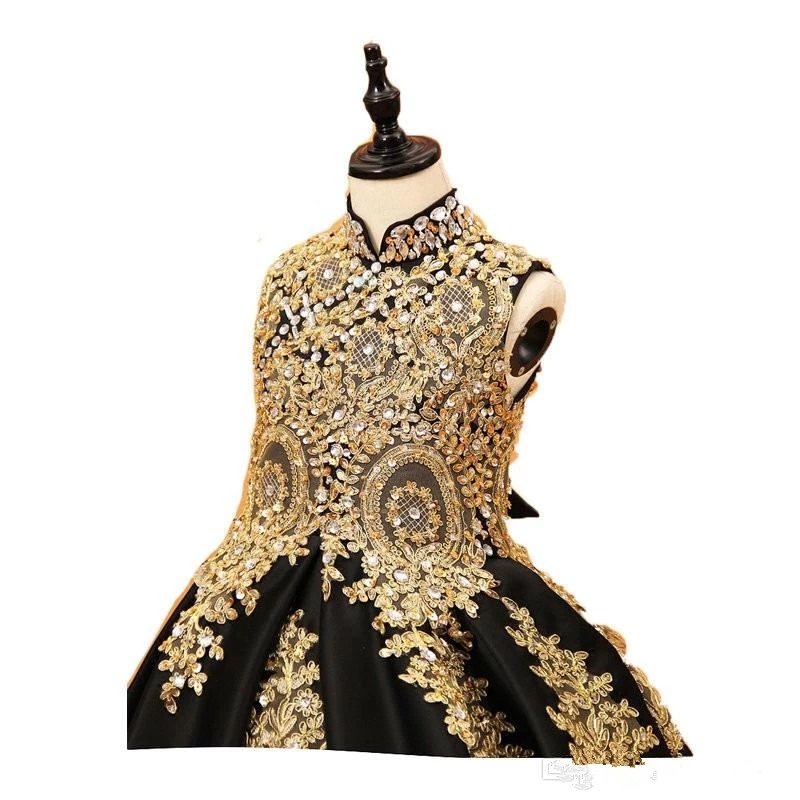 Luxurious Black And Gold Lace Flower Girls Dress High neck With Corset Back Crystal Designer Girl First Communion Pageant Gown