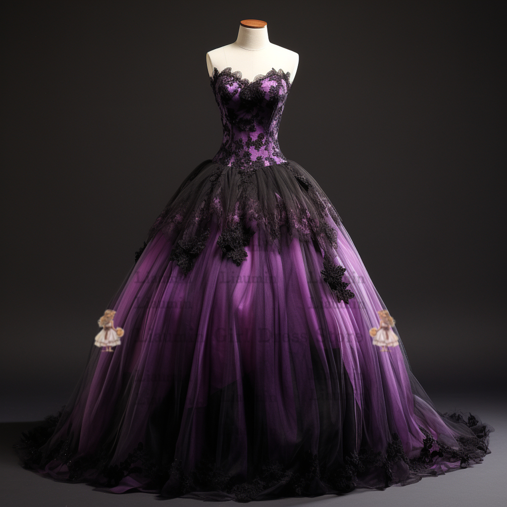 Purple and Black Lace Applique Strapless Ball Gown Full Length Evening Party Prom Dress Formal Occasion Hand Made Custom W2-3.5