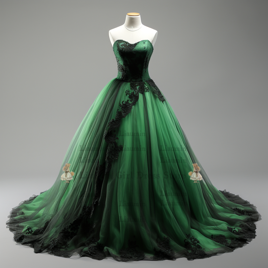Green and Black Lace Applique Strapless Tulle Ball Gown Full Length Evening Clothing Formal Prom Dress Hand Made Custom W2-17.6