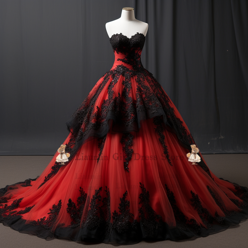 Red and Black Lace Applique Strapless Ball Gown Wedding Dress Robe De Mariage Plus Size Full-Length Bridal Gown Bride Dress W3-2.10