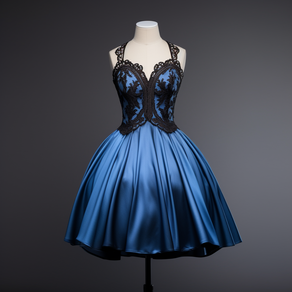 Blue Satin and Black Lace Edge Applique Strapless Short Length Lace Up Back Evening Dress Brithday Elagant Clothing Custom W1-19.2