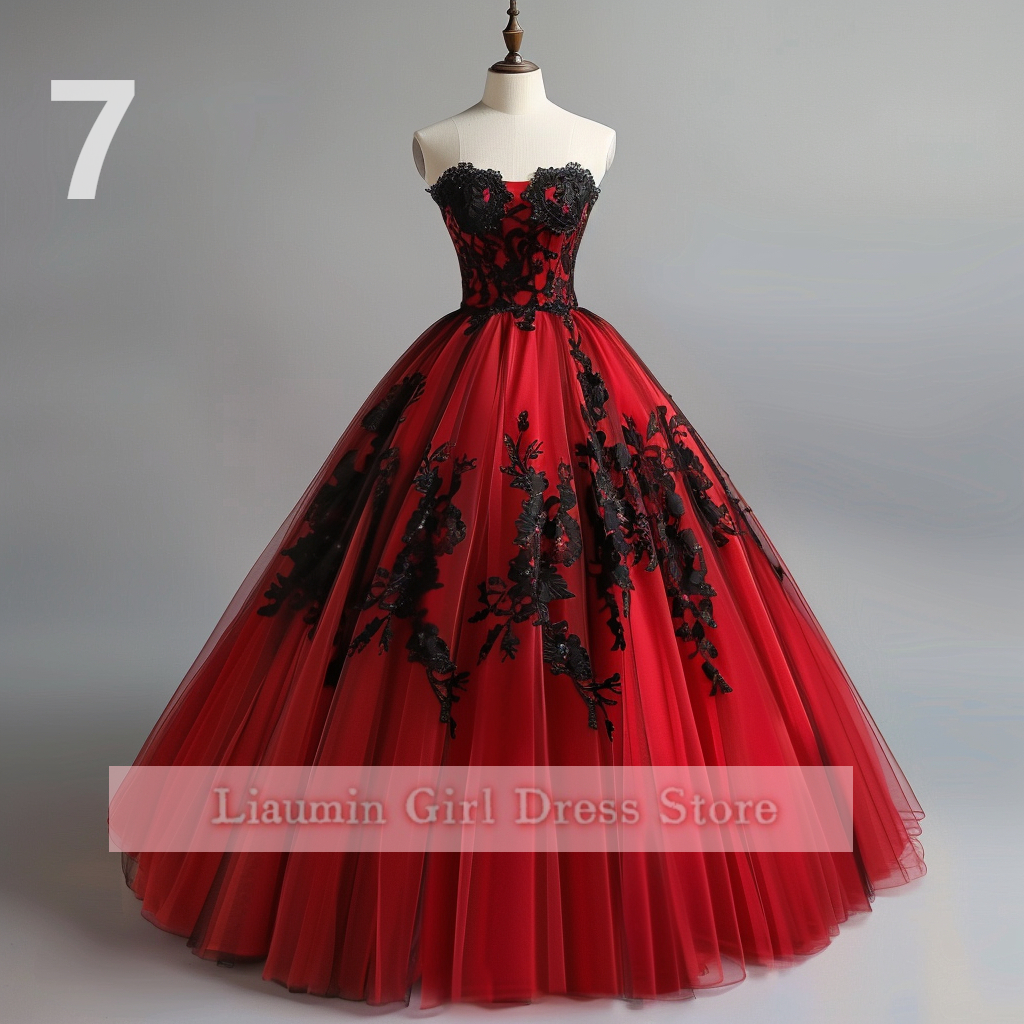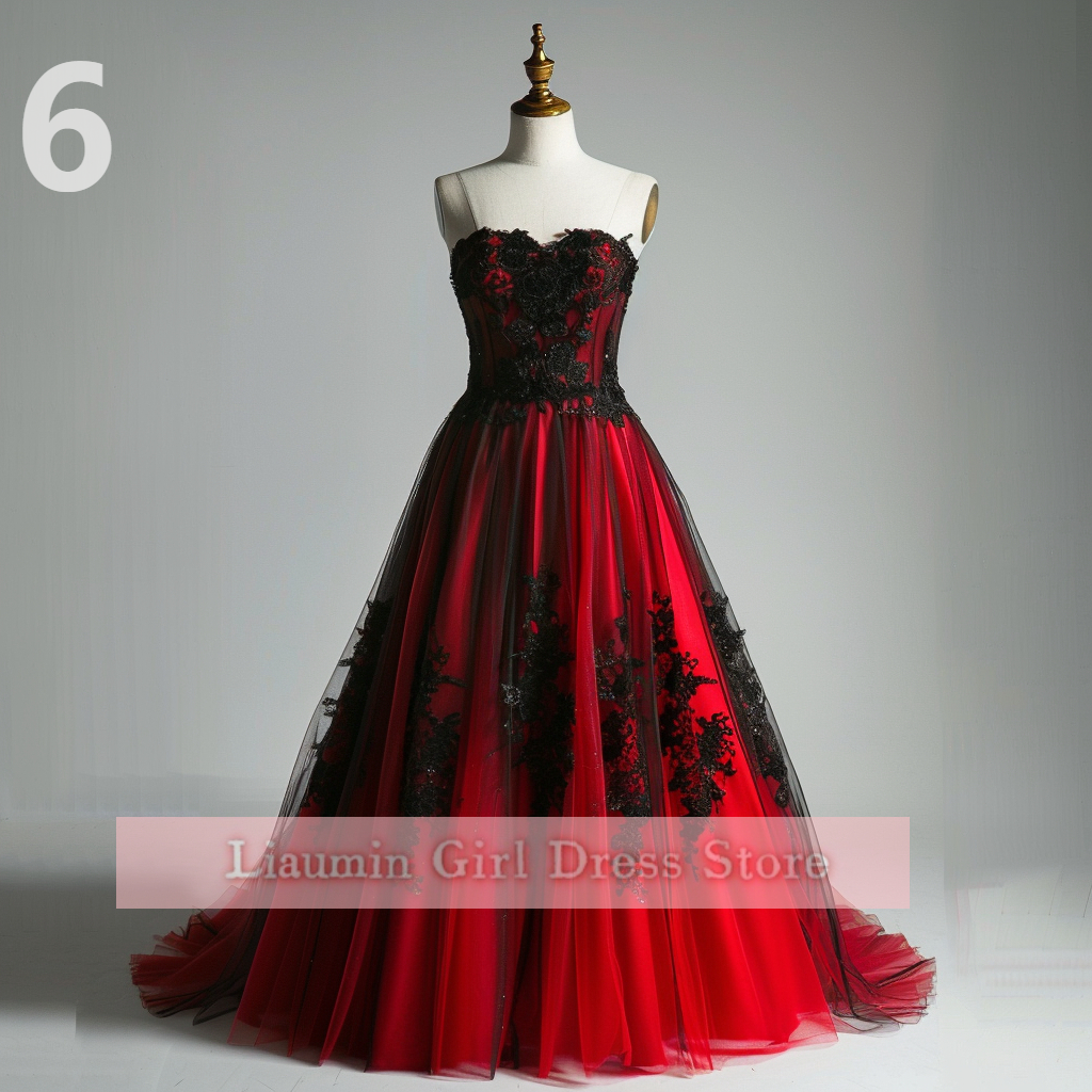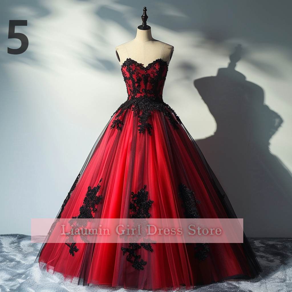 Red and Black Lace Applique Tulle Sweetheart Strapless Ball Gown Floor Length Evening Formal Party Prom Dress Hand Made W11-2