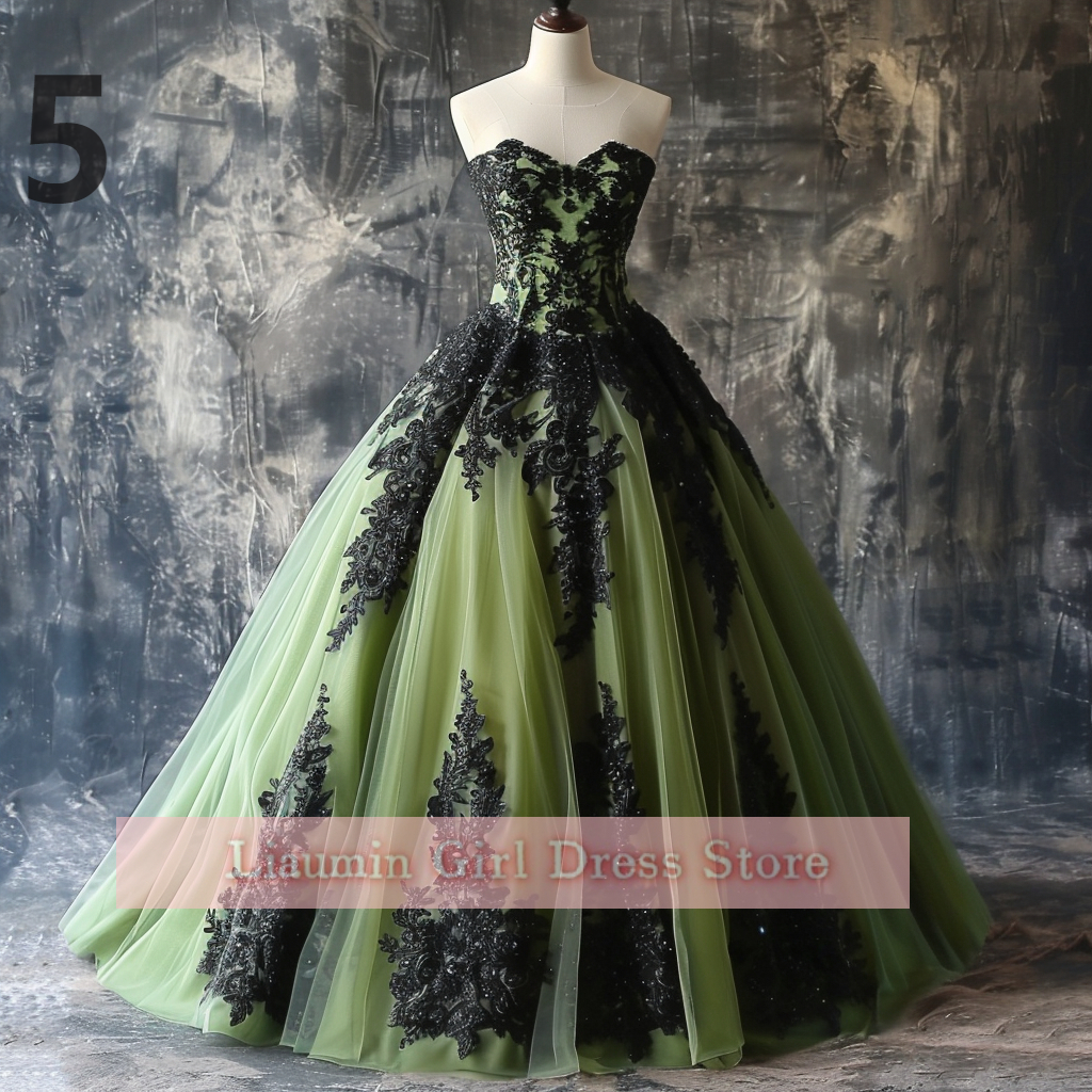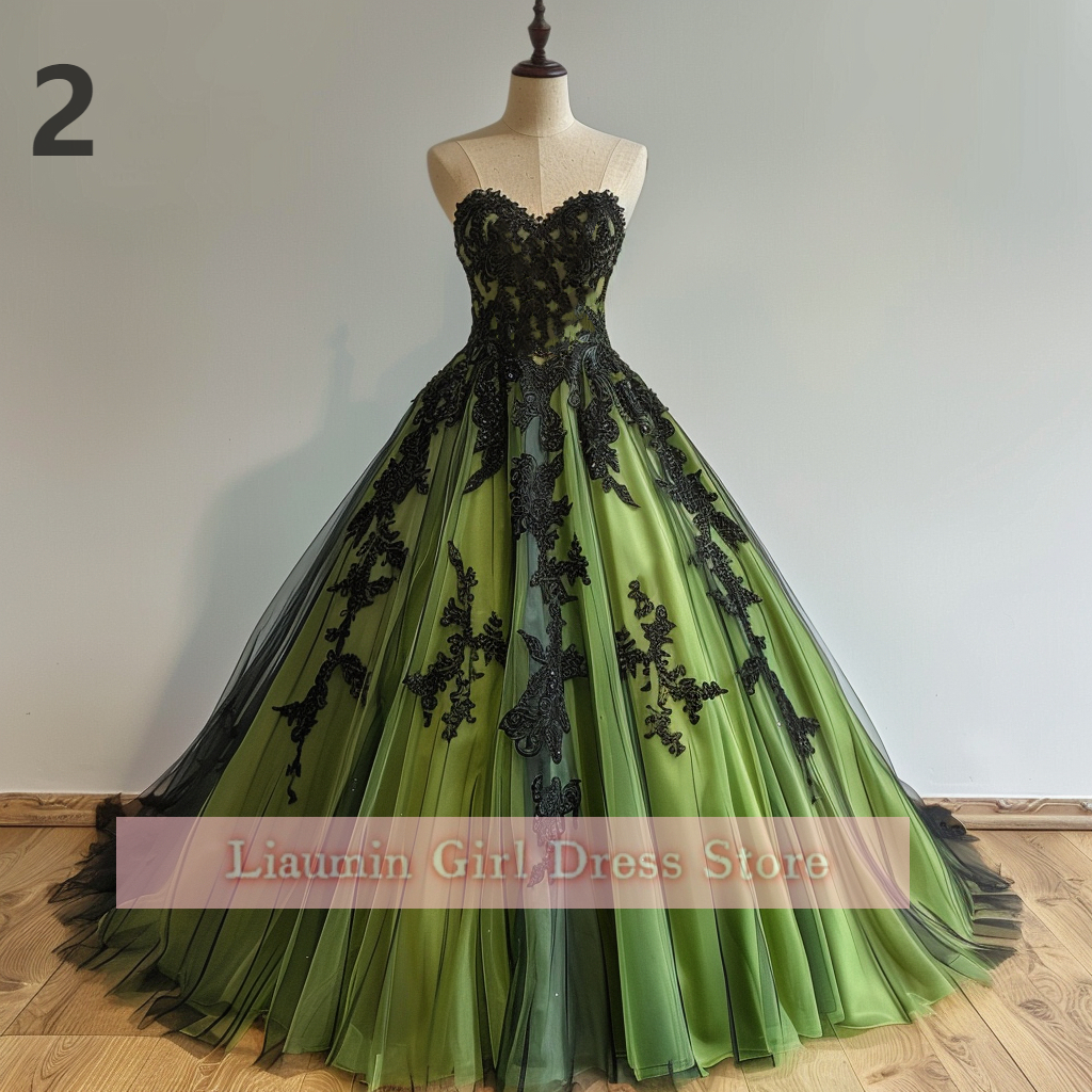 Green and Black Lace Applique Sweetheart Strapless Ball Gown Full Length Evening Formal Party Prom Dress Hand Made Custom W11-6
