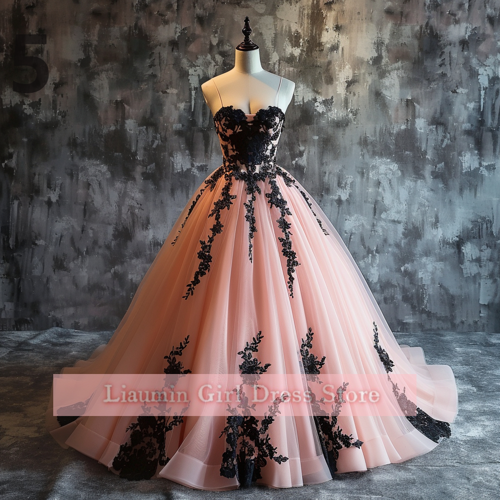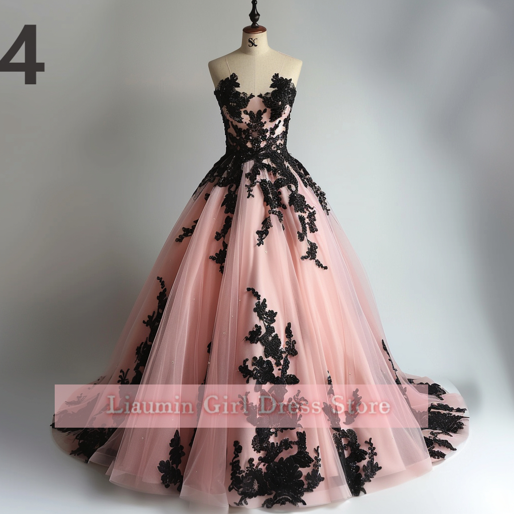 Pink and Black Lace Applique Strapless Ball Gown Full Length Evening Formal Occasion Party Prom Princess Dress Custom W11-14