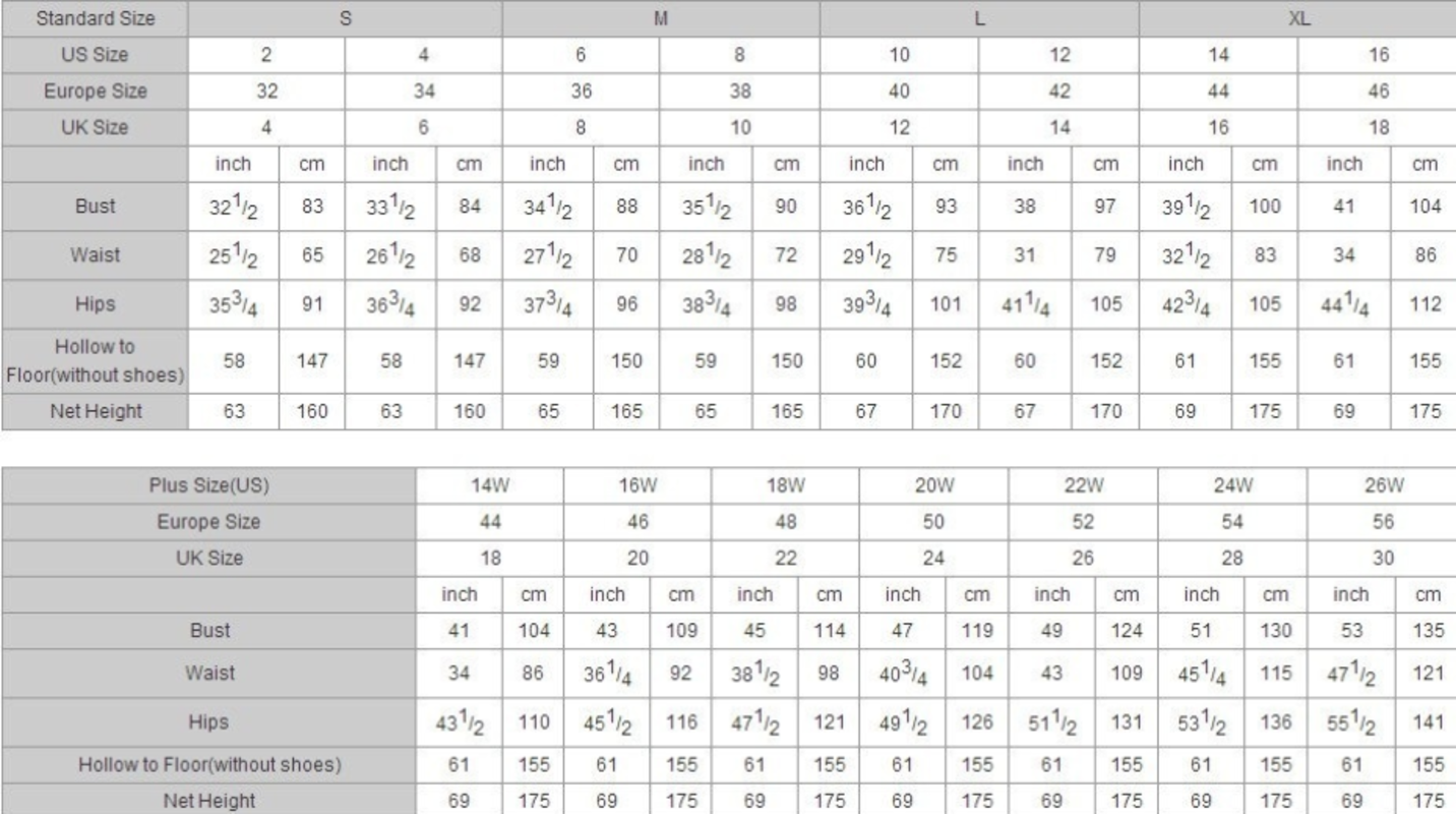 Hollow to Hem___inch/cm (for short dress) ; Hollow to Floor___inch/cm (for long dress) Height:___ inch/cm