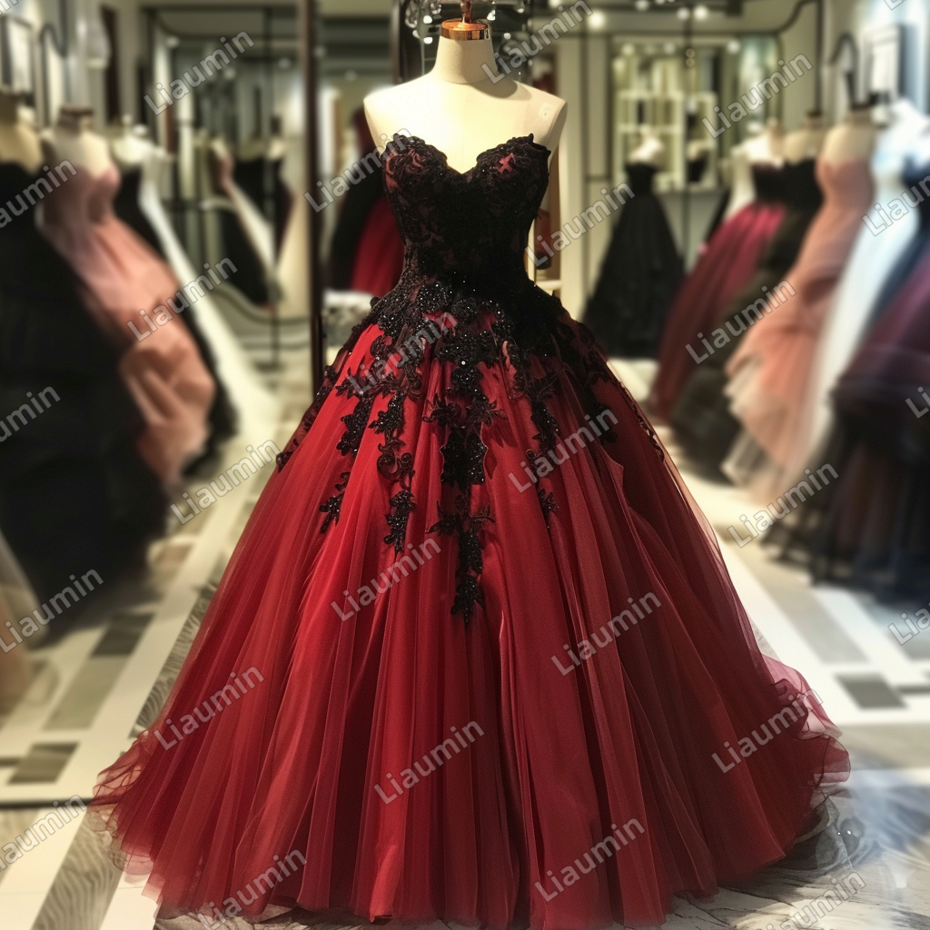 Red and Black Lace Applique Strapless Full Length Tull Prom Dress Evening Dress Custom Hand Made J4-2.2