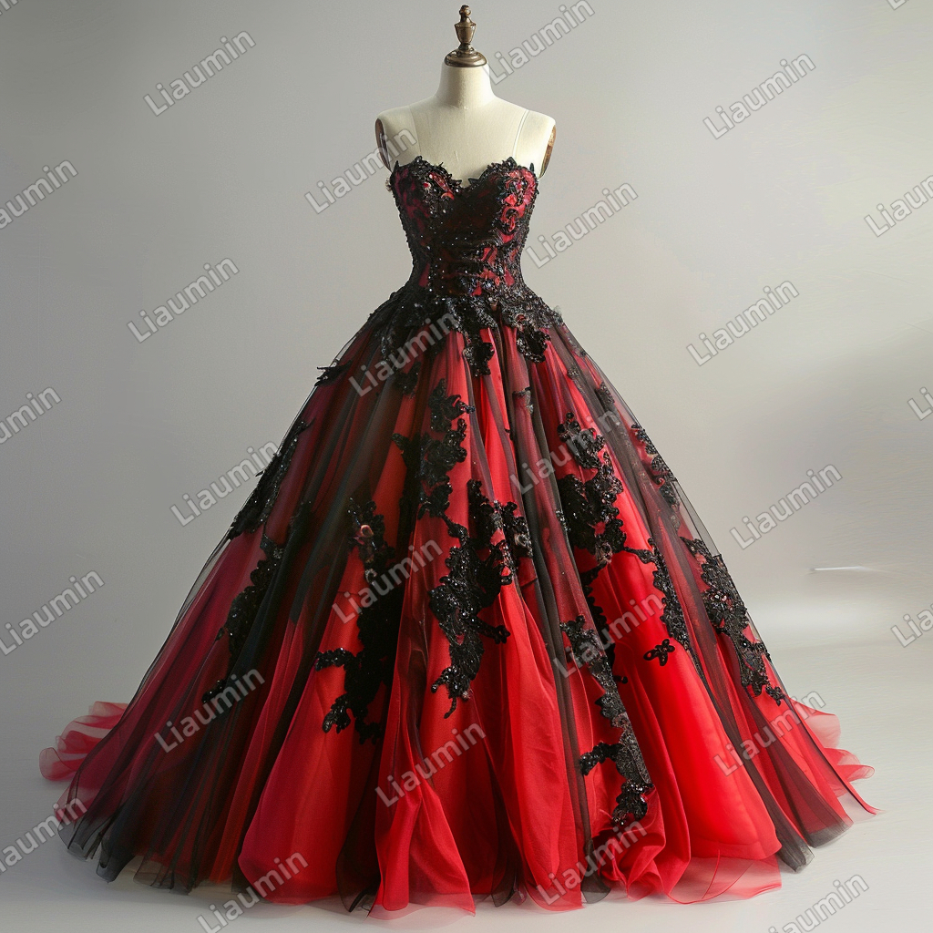 Red and Black Lace Applique Strapless Full Length Tull Prom Dress Evening Dress Custom Hand Made J4-4.1