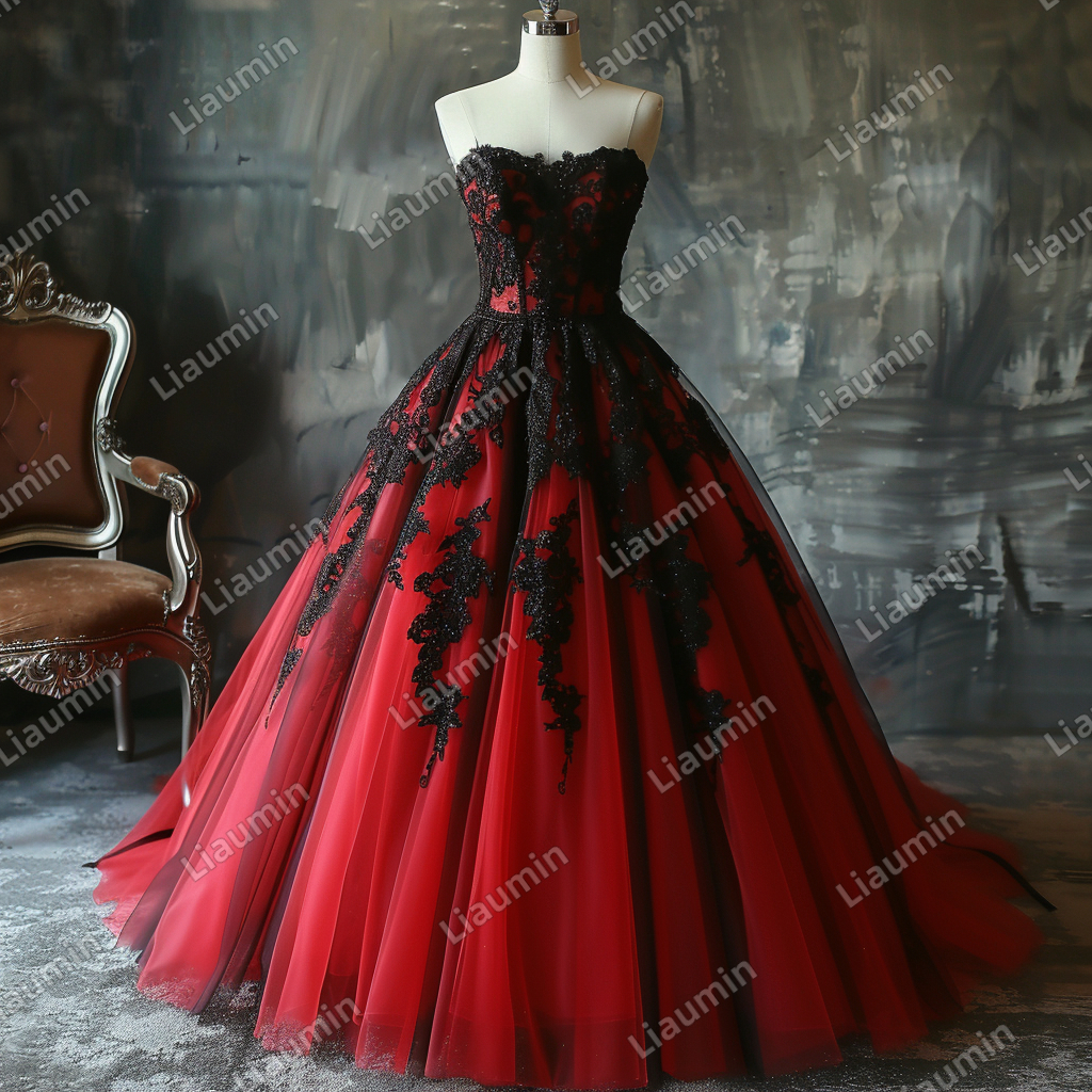 Red and Black Lace Applique Strapless Full Length Tull Prom Dress Evening Dress Custom Hand Made J4-4.2