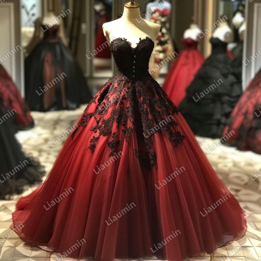 Red and Black Lace Applique Strapless Full Length Tull Prom Dress Evening Dress Custom Hand Made J4-6.6
