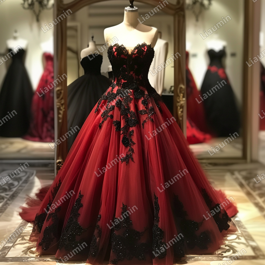 Red and Black Lace Applique Strapless Full Length Tull Prom Dress Evening Dress Custom Hand Made J4-7.1