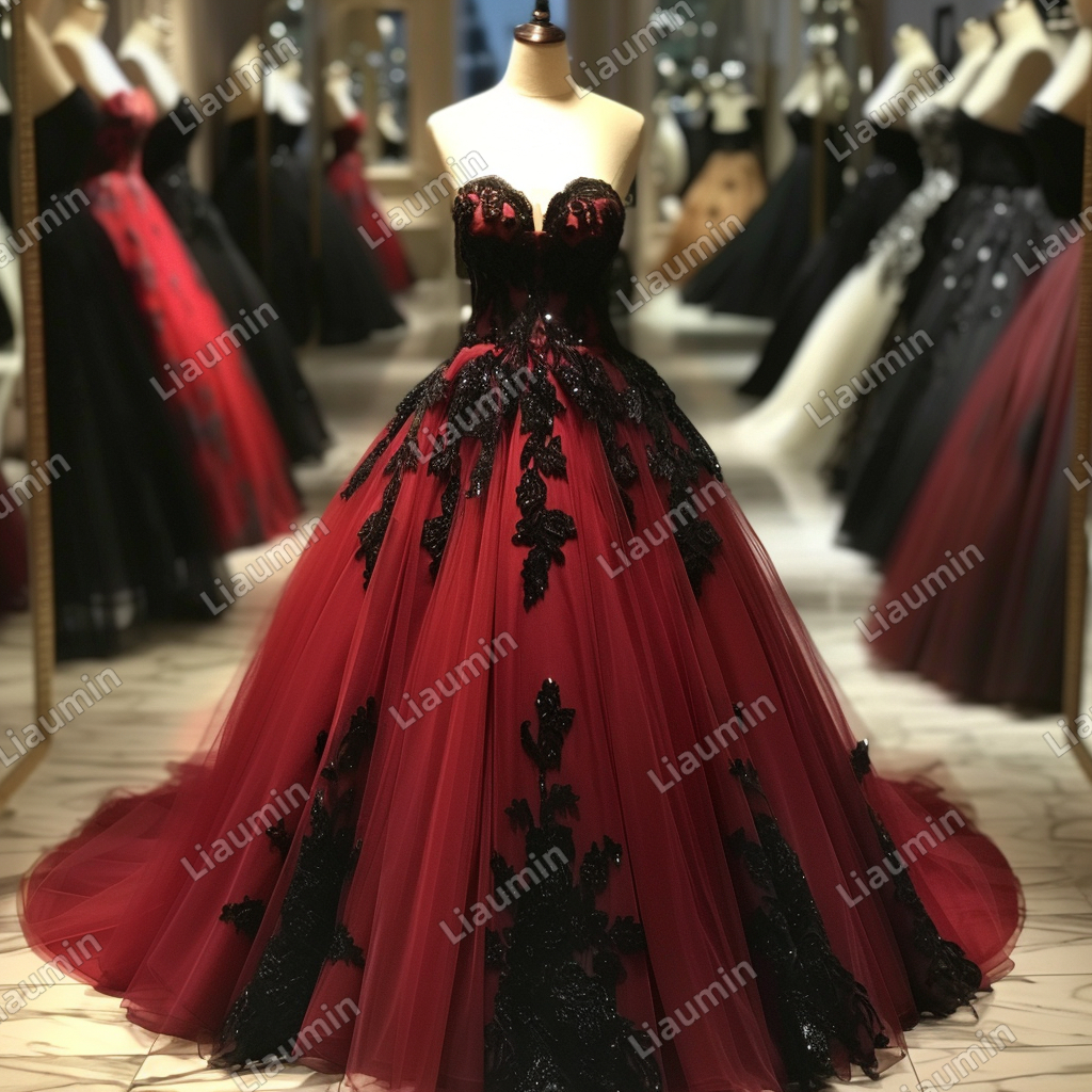 Red and Black Lace Applique Strapless Full Length Tull Prom Dress Evening Dress Custom Hand Made J4-7.5