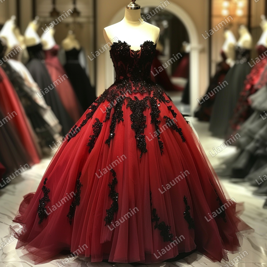 Red and Black Lace Applique Strapless Full Length Tull Prom Dress Evening Dress Custom Hand Made J4-7.10