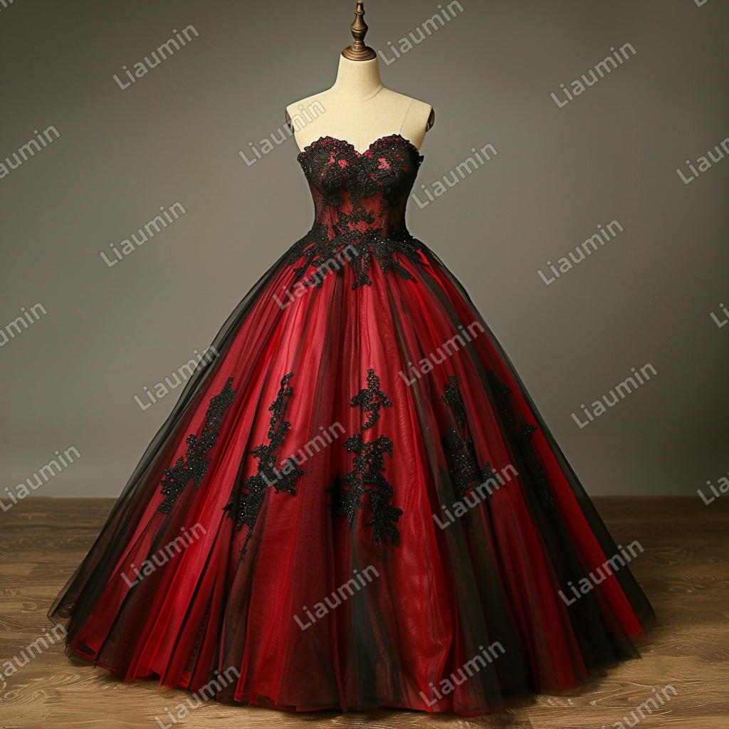 Red and Black Lace Applique Strapless Full Length Tull Prom Dress Evening Dress Custom Hand Made J4-8.11