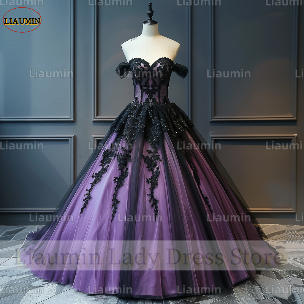 Purple Tulle and Black Lace Applique Strapless Full Length Tull Prom Dress Evening Dress Custom Hand Made A4-3.2