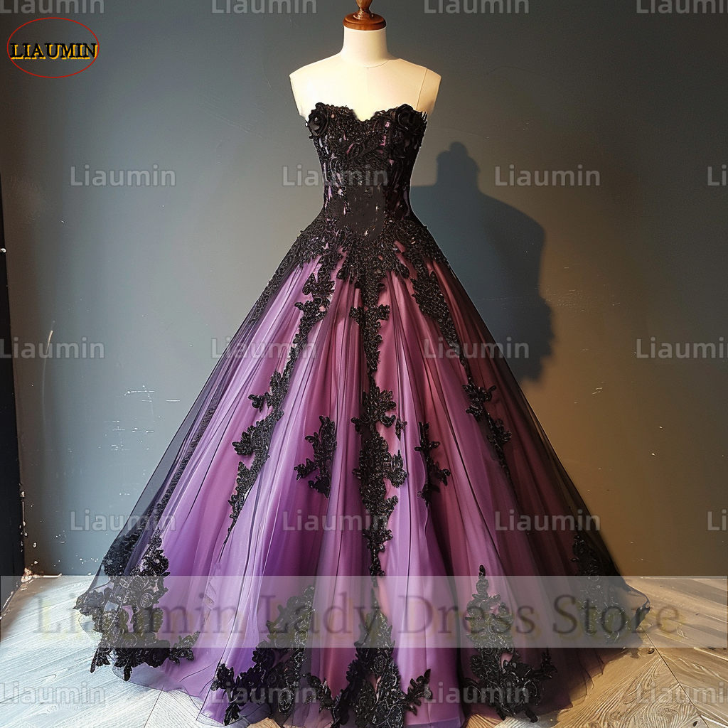 Purple and Black Lace Applique Strapless Full Length Tull Prom Dress Evening Dress Custom Hand Made A4-3.6