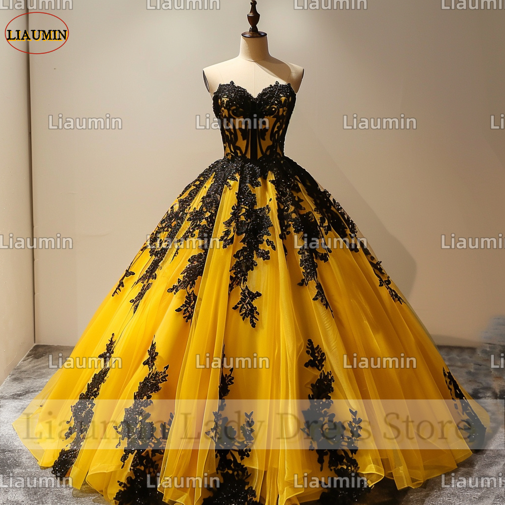 Yellow Tulle and Black Lace Applique Strapless Full Length Tull Prom Dress Evening Dress Custom Hand Made A4-7.1