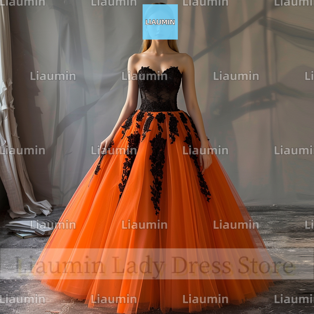 Orange Tulle and Black Lace Applique Strapless Full Length Tull Prom Dress Evening Dress Custom Hand Made A4-11.8