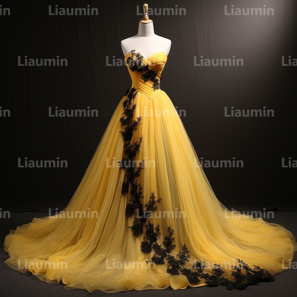 Yellow Tulle and Black Lace Applique Strapless Full Length Prom Dress Evening Dress Custom Hand Made A2-6.1