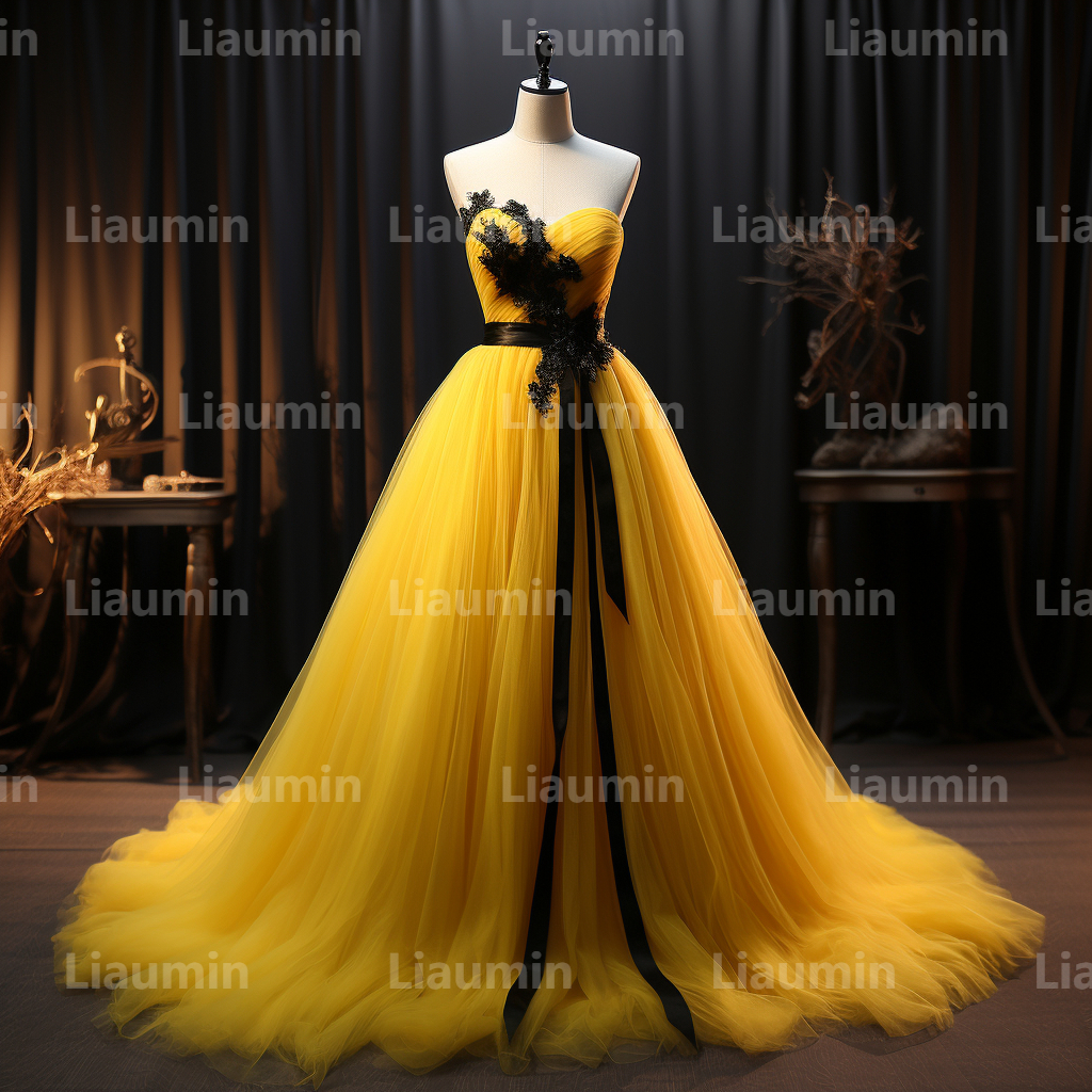 Yellow Tulle and Black Lace Applique Strapless Full Length Tull Prom Dress Evening Dress Custom Hand Made A2-6.9