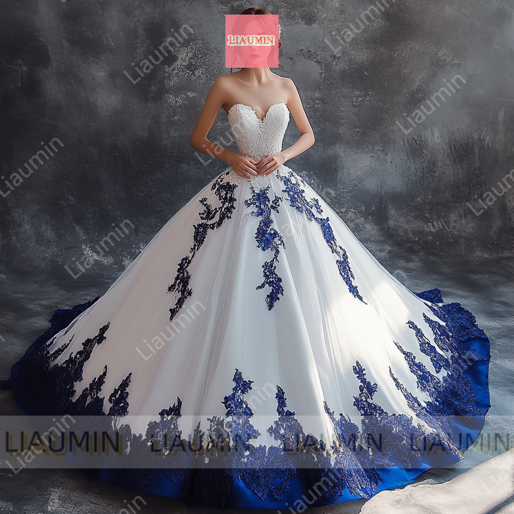 White and Blue Tulle Strapless Full Length Prom Dress Evening Dress Custom Hand Made W19-2.4